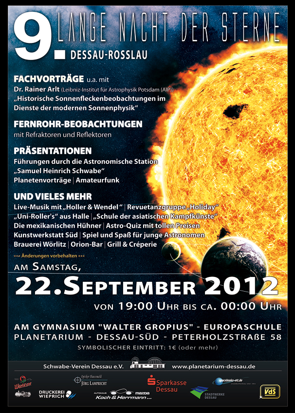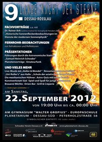 Zur mittlerweile 9. Sternennacht in Dessau-Ro�lau laden der Schwabe-Verein Dessau e.V. sowie Sch�ler und Lehrer des Walter-Gropius-Gymnasiums am 22. September ein. Von 19.00 Uhr bis 01.00 Uhr wird unter dem diesj�hrigen Motto "Die Sonne" wieder astronomisch Wissenswertes und Unterhaltendes zu erleben sein.